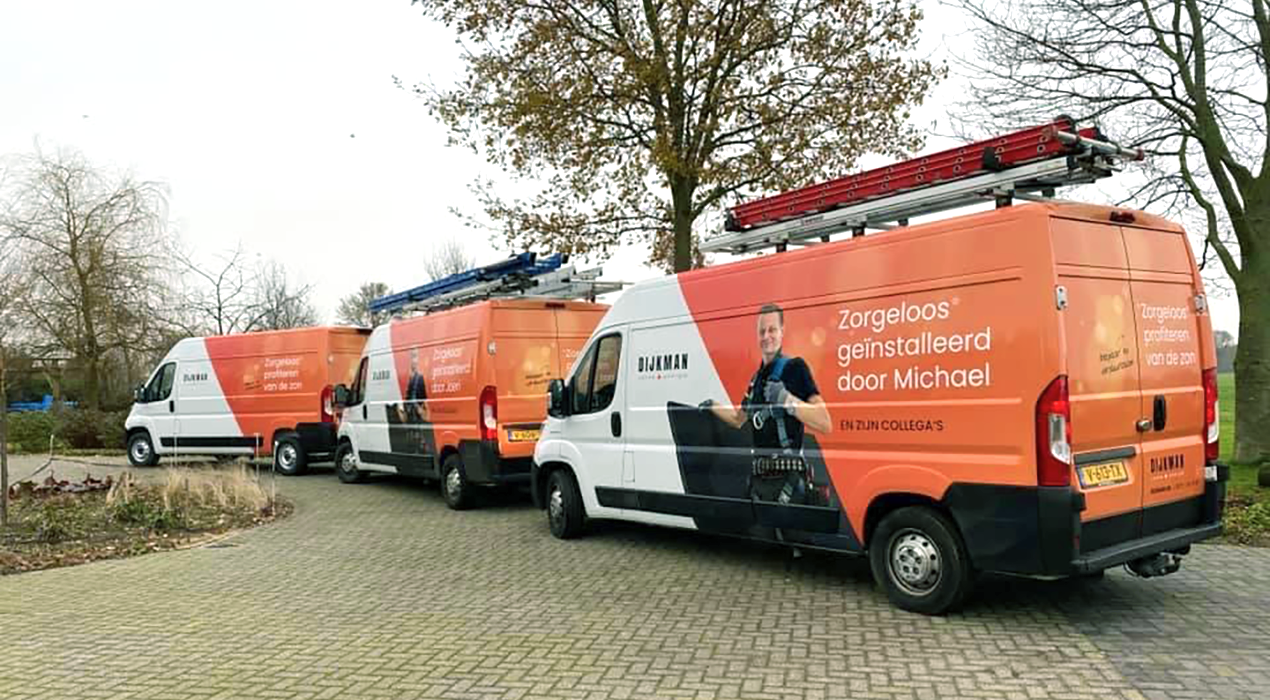 De ontwikkeling van het logo en de website is gedaan door Adwise digital agency. Ik werd ingeschakeld voor de verdere ontwikkeling van de visuele identiteit van Dijkman Zonne-energie. Van correspondentiemiddelen, advertenties, folders en signing tot aan wagenpark en social sjablonen.